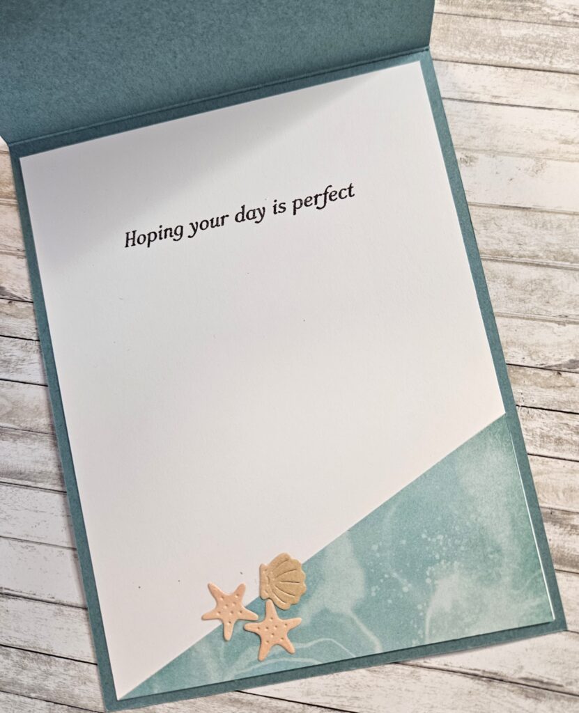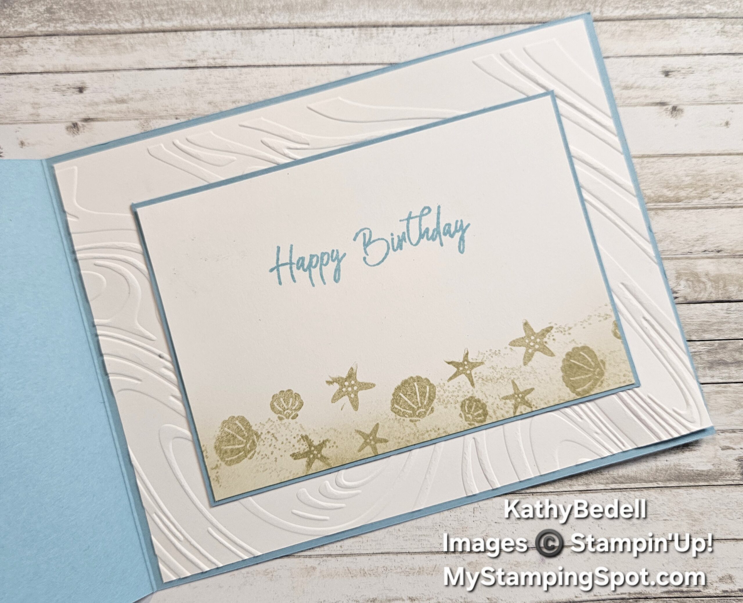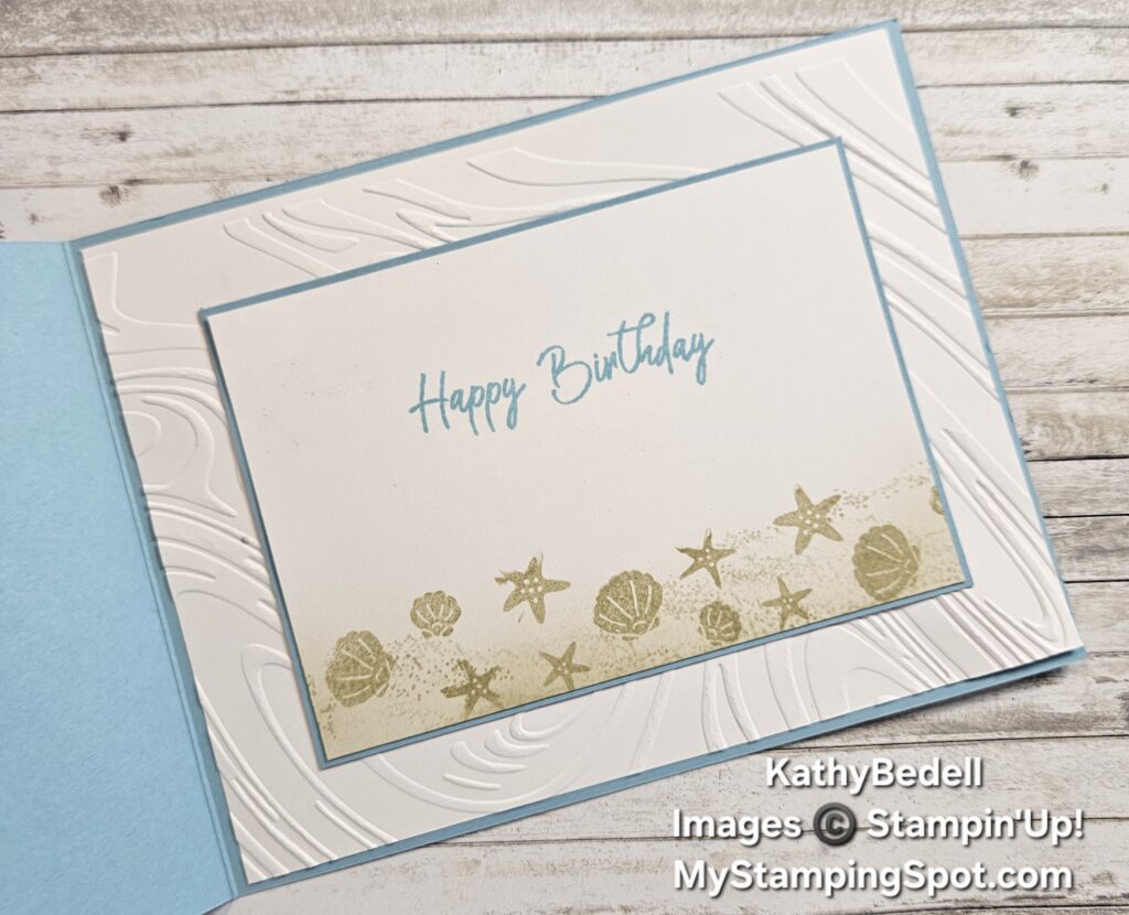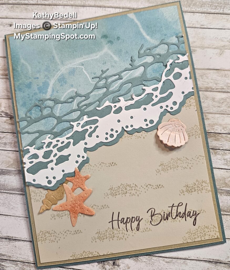 The final card of this class is done in a much deeper ocean tone. I used both Azure Afternoon and Gorgeous Grape to add depth of color to the “ocean water”.
