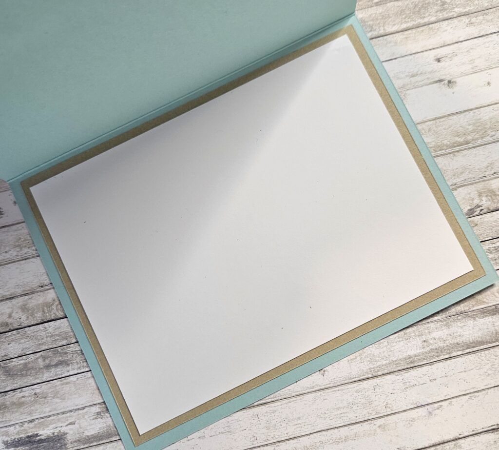 Card stock: Balmy Blue cut to 8 ½” x 5 ½”, scored at 4 ¼”. Two Tone Basic Beige cut to 5” x 3 ¼” Pastels Shimmer Paper #167198 $10 for die cutting Pool Party cut to 5” x 3” then die cut. White cut to 5” x 3 ¾” and ½” x 4” Two Tone Crumb Cake cut to5 ¼” x 4” and a piece cut to 5 ¼” x 3 ½”