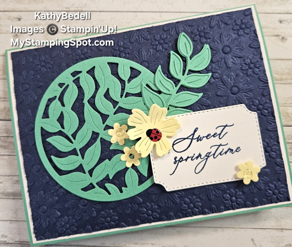 The last card, although in jewel tones, really has that spring feel. I think it is the Shy Shamrock popping on the Night of Navy!