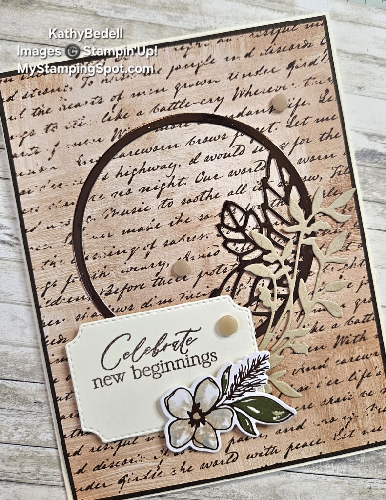 Crumb Cake, Earthen Toned Metallic Paper #165901 $7.50 and Delicate Details DSP #167498 $16.50 for die cuttingAccessories: Springtime Scenes Dies #167460 $39, Natural Matte Dots #167510 $8, Delicate Whispers Dies #167505 $34