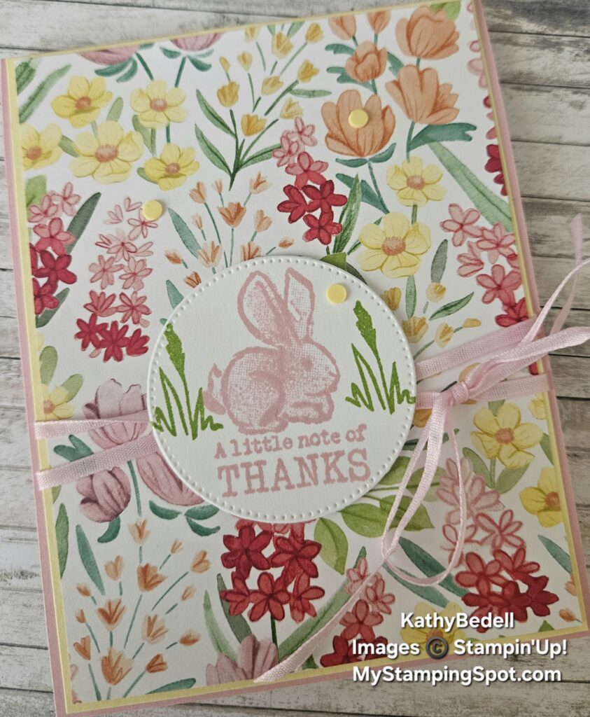 Our last card is so spring and cheery! It features the Product of the Month which can be purchased for $5 with a $75 purchase.