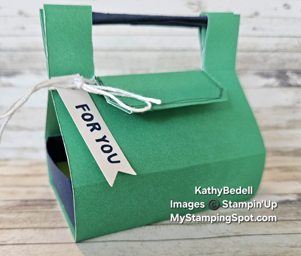 Night of Navy cut to 4” x 5 ¼”, scored at 1” on all four sides. You will also need a piece cut to 3” x 1 ¼” for the handles.