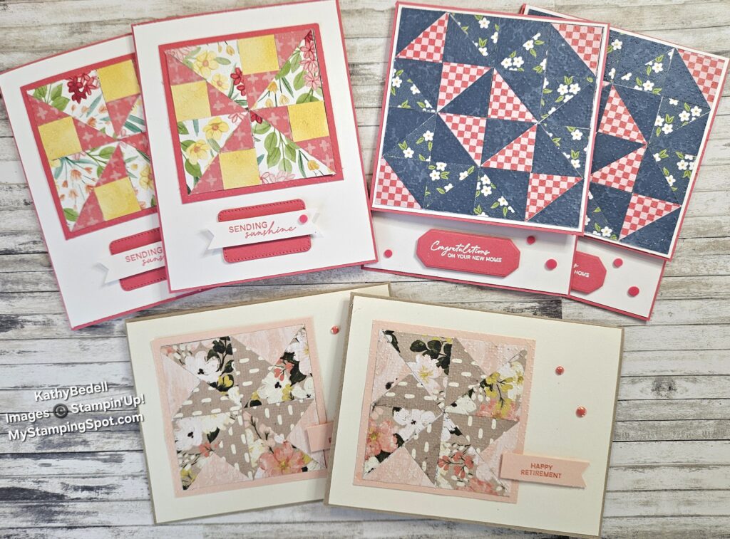 Send springy comfort to loved ones with this class. You will get all the pieces cut, die cut and ready to assemble, emboss and stamp. You will make six cards, 2 of each design.